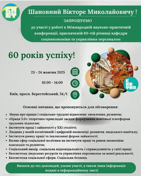 23-24 жовтня 2025 р. в Київському національному університеті імені Вадима Гетьмана відбулась Міжнародна науково-практична конференція «Праця в XXI столітті: новітні тенденції, соціальний вимір, інноваційний розвиток», присвячена 60-ій річниці кафедри соціоекономіки та управління персоналом. На конференції з доповіддю на тему «Людина versus штучний інтелект: комплементарність та/або субституція?» виступив зав. кафедри, чл.-кор. НАН України Віктор Тарасевич.