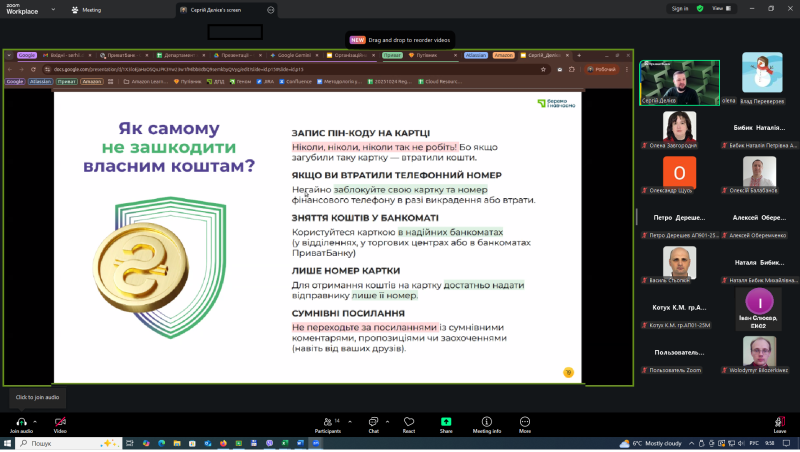 13 листопада 2025 року у межах дисципліни «Управління інноваційною діяльністю» для магістрантів груп ЕК01, ЕК02, ЕП01, ФК01, АП01, АВ01, МВ01, МВ04, МВ05, МЕ10 – 25м проф. Завгородньою О.О. та менеджером проєктів АТ КБ «Приватбанк» Сергієм Делієвим була проведена спільна відкрита лекція з особливостей фінансового забезпечення інноваційних проєктів, безпечних технологій інвестування та заощаджень у період нестабільності. Наголос був зроблений на особливостях фінансування інноваційних стартапів, засадах оптимізації прибутковості й ризикованості інвестицій, засобах захисту власних коштів від шахрайських схем та сумнівних бізнес-пропозицій, безпечного онлайн-банкінгу.