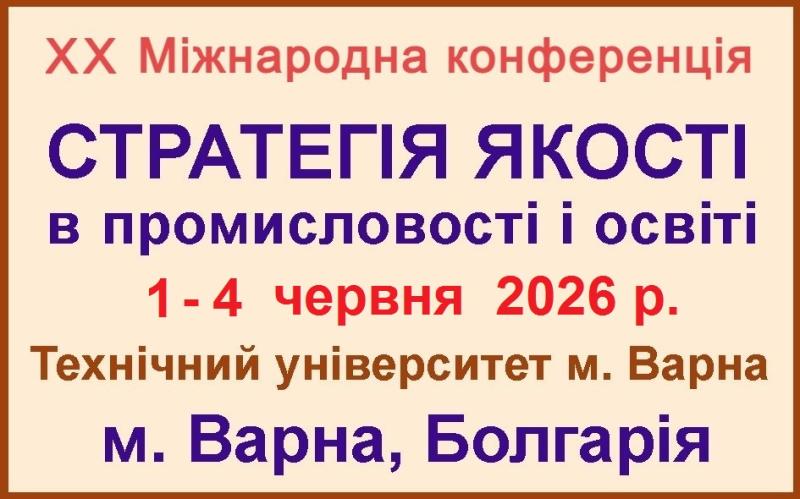 Запрошуємо Вас взяти участь у ХХ Міжнародній конференції «Стратегія якості в промисловості та освіті» (передбачена Планом МОН наукових, науково-технічних заходів на 2026 рік), що відбудеться 1-4 червня 2026 р. у Технічному університеті м. Варна (Болгарія) /в очному та частково заочному (он-лайн) форматі/. Заплановане видання збірника матеріалів, що матиме міжнародний індекс (ISBN). Серед заходів конференції – стажування з отриманням сертифікату від ТУ-Варна про стажування в університеті країни ЄС (для заочної форми умови підлягають уточненню). Бланки заявок на участь і детальніша інформація на сторінці організаторів (перейти).